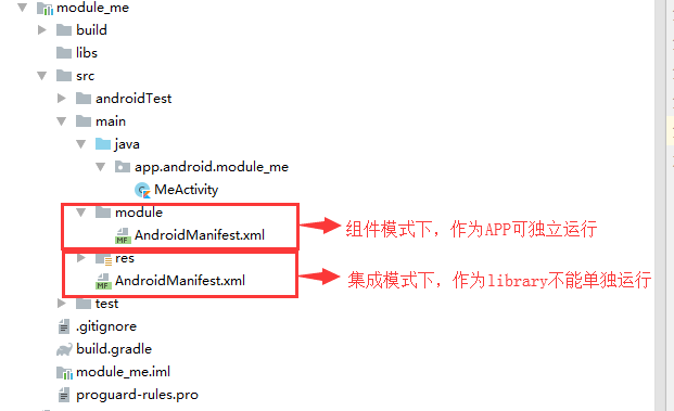 - Android Studio会为每个module生成对应的AndroidManifest.xml文件,声明自身需要的权限、四大组件、数据等内容;当module属性为app时,其对应的AndroidManifest.xml需要具备完整app所需要的所有配置,尤其是声明Application和launch的Activity;当module属性为library时,如果每个组件都声明自己的Application和launch的Activity,那在合并的时候就会发生冲突,编译也不会通过,所以,就需要为当前module重新定义一个AndroidManifest.xml文件,不声明Application和launch的Activity,然后根据isModule的值指定AndroidManifest.xml的路径。
