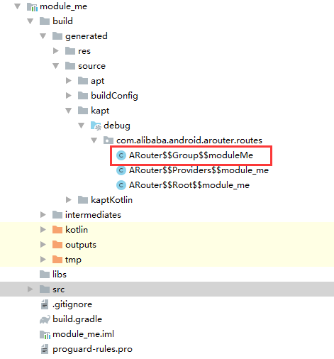 “kapt “com.alibaba:arouter-compiler:1.2.2””必须在每个可跳转的module中引用,因为他会根据注解的类在build中生成对应的文件,比如在module_me中有这样一段代码